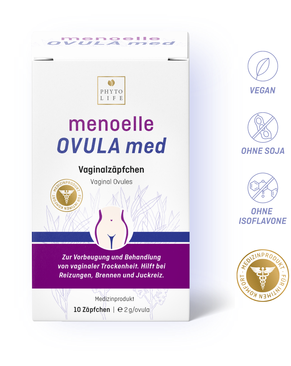 • menoelle® OVULA med ist ein Medizinprodukt, das die natürlichen Abwehrkräfte der Vagina unterstützt und die Erholung der Vaginalflora fördert.